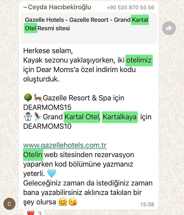 Ceyda Hacıbekiroğlu, otelin işleyişine dair bir sorumluluğu bulunmadığını beyan etmesine rağmen, başka bir WhatsApp yazışması ortaya çıkmıştır. Okul sınıfı grubunda düzenlenen bir kampanyanın, hayatını kaybeden Doğan ailesinin dikkati çekmesiyle otelde kalmalarına neden olduğu iddia edilmiştir.