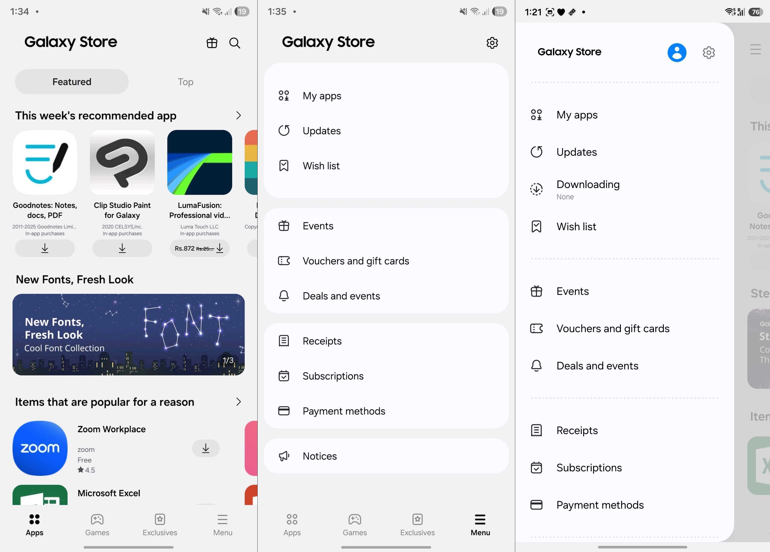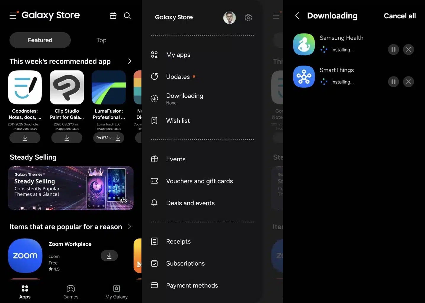 Yeni Galaxy Store, alt gezinme çubuğundaki Menü sekmesini kaldırıp sol tarafa kenar çubuğu olarak yerleştiriyor. Samsung Galaxy Store başlık bölümüne, tasarım değişikliklerinin bir parçası olarak menü öğelerini genişletmenize olanak tanıyan bir menü eklendi. Gezinme çubuğu daha önce dört öğe içeriyordu ve Menü, kenar çubuğu olarak yeniden konumlandırıldı. Uygulamalar ve Oyunlar olduğu gibi kalırken, Özel Ürünler sekmesi “Galaxy’im”e dönüştü. Yeni Menü sekmesi, indirilen veya güncellenen uygulamaların ilerlemesini gösteren yeni “İndiriliyor” bölümü içeriyor. Bölümlere göre ayırma özelliği de tüm ekranı kaplamayan aşamalı bir sayfayla değiştirildi. Genel yazı tipleri de önceki sürüme göre biraz daha büyük görünüyor. Arka plan rengi de biraz değiştirilmiş gibi görünüyor; yeni sürüm açık modda daha canlı görünüyor.