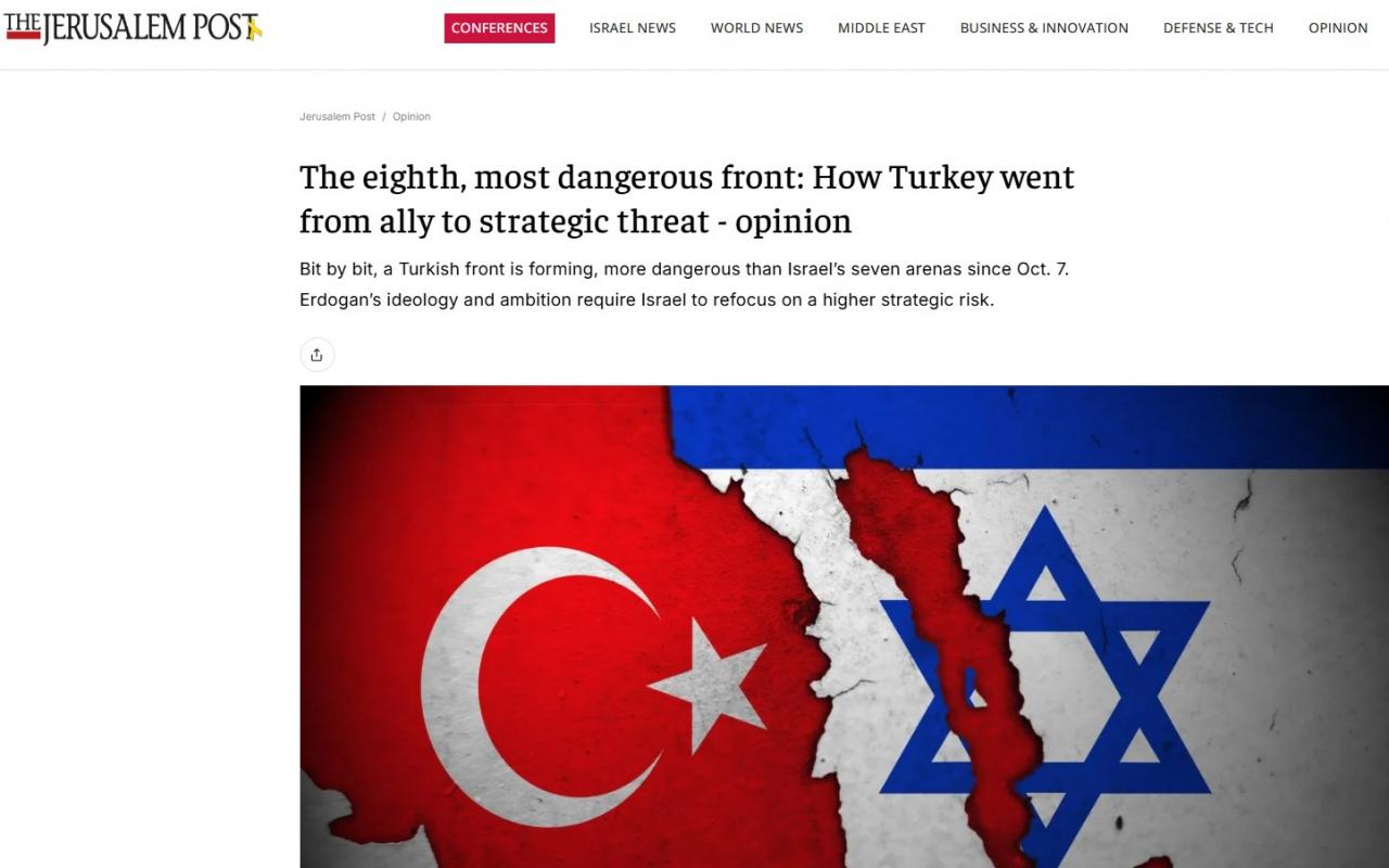 İsrailli yayın organı The Jerusalem’de 22 Aralık 2025’te yayınlanan haberde “7 Ekim’den bu yana İsrail’in yedi arenasından daha tehlikeli bir Türk cephesi oluşuyor.” denildi. Giora Eiland imzasıyla yayınlanan analizde Türkiye’nin İsrail için tehdit oluşturduğu belirtilerek bu tehdidin keyfiyeti incelendi.