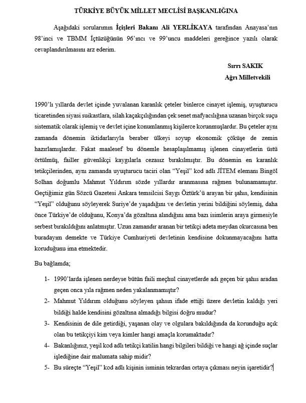 DEM Parti Ağrı Milletvekili Sırrı Sakık, konuyu TBMM’ye taşıyarak İçişleri Bakanı Ali Yerlikaya’ya sorular yöneltti. Sakık, süreç devam ederken Yeşil isminin yeniden ortaya çıkmasının neyin işareti olduğunu sordu.